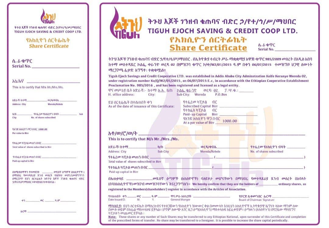 ለእያንዳንዳቸው አባላቶቻችን ደረጃውን የጠበቀ የላቀ ጥራት ያለው የአክሲዮን (የዕጣ) ሰርተፊኬት ተዘጋጅቶ ተጠናቋል።